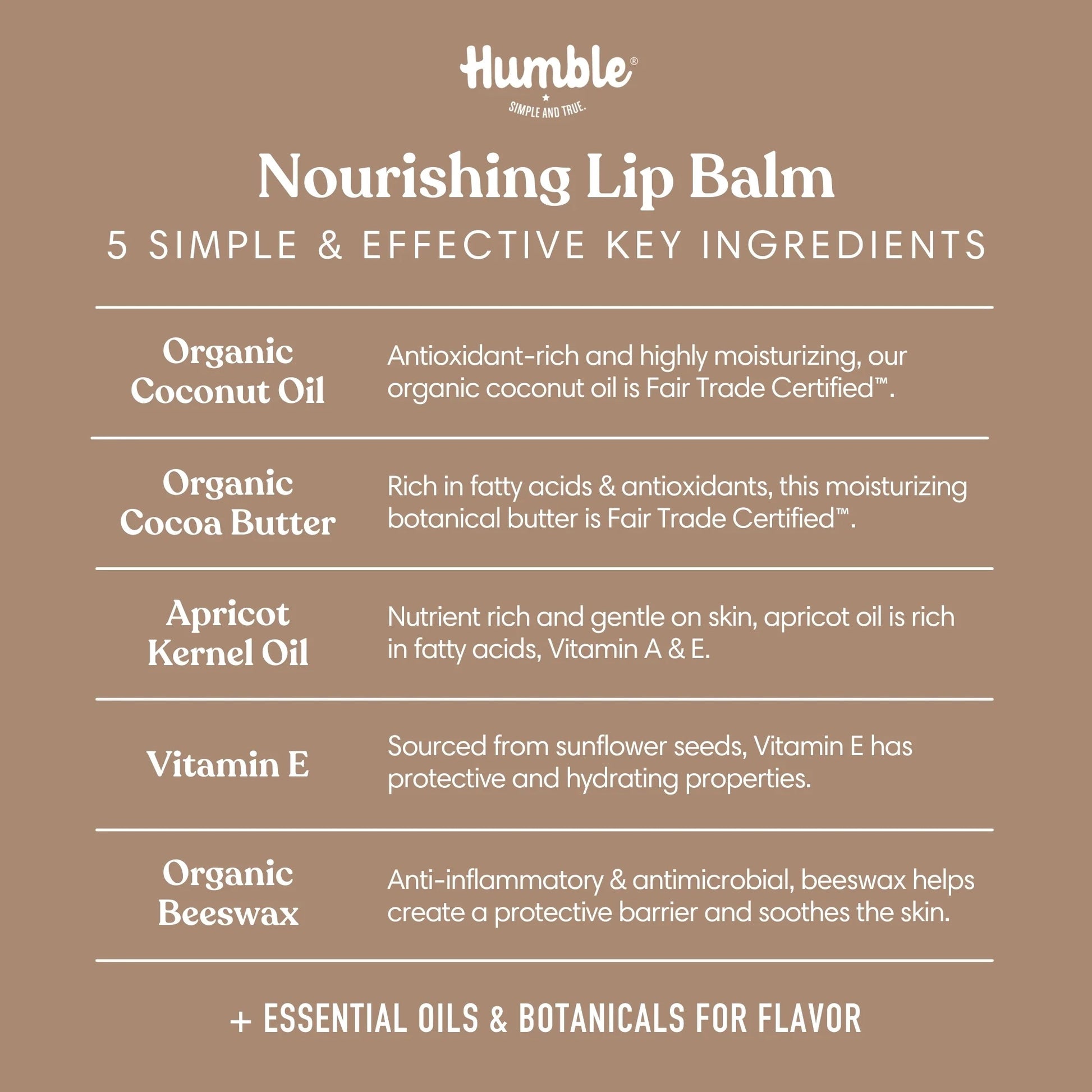 Humble Nourishing Lip Balm Simply Unscented gir intens fukt og beskyttelse helt uten smak eller duft. Perfekt for deg som ønsker en helt nøytral leppepomade med rene, enkle ingredienser. Formelen bygger på kun 5 nøkkelingredienser som gir langvarig pleie og en naturlig myk følelse.