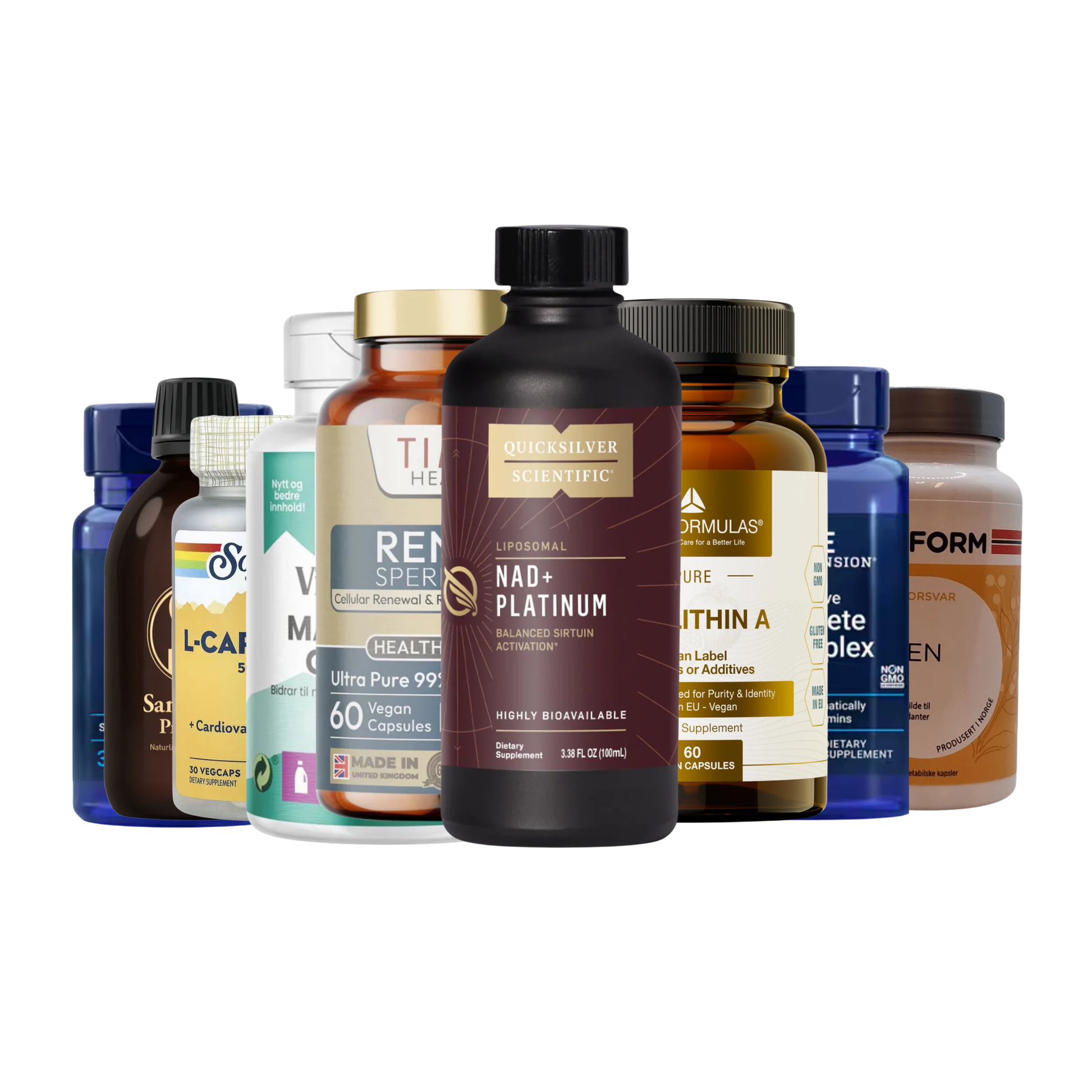 Urolithin A, L-Carnitine 500 mg, Spermidine Renew, PQQ 20 mg, NAD+ Platinum, Magnesium Glysinat, Q10 Selen Kaneka Ubiquinol, BioActive Complete B-Complex.