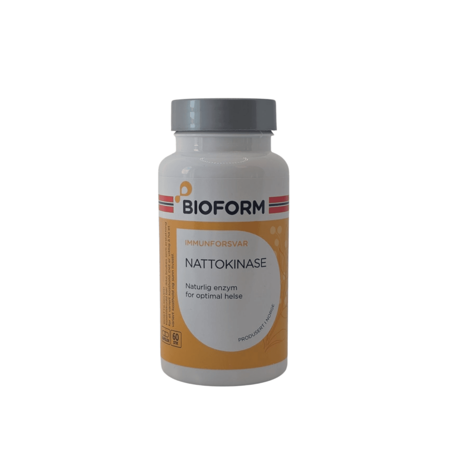 Bioform Nattokinase inneholder 100 mg nattokinase per kapsel, standardisert til 2000 fibrinolytiske enheter (FU). Nattokinase er et enzym utvunnet fra fermenterte soyabønner (natto) og er kjent for sin evne til å støtte normal blodstrøm og kardiovaskulær helse.