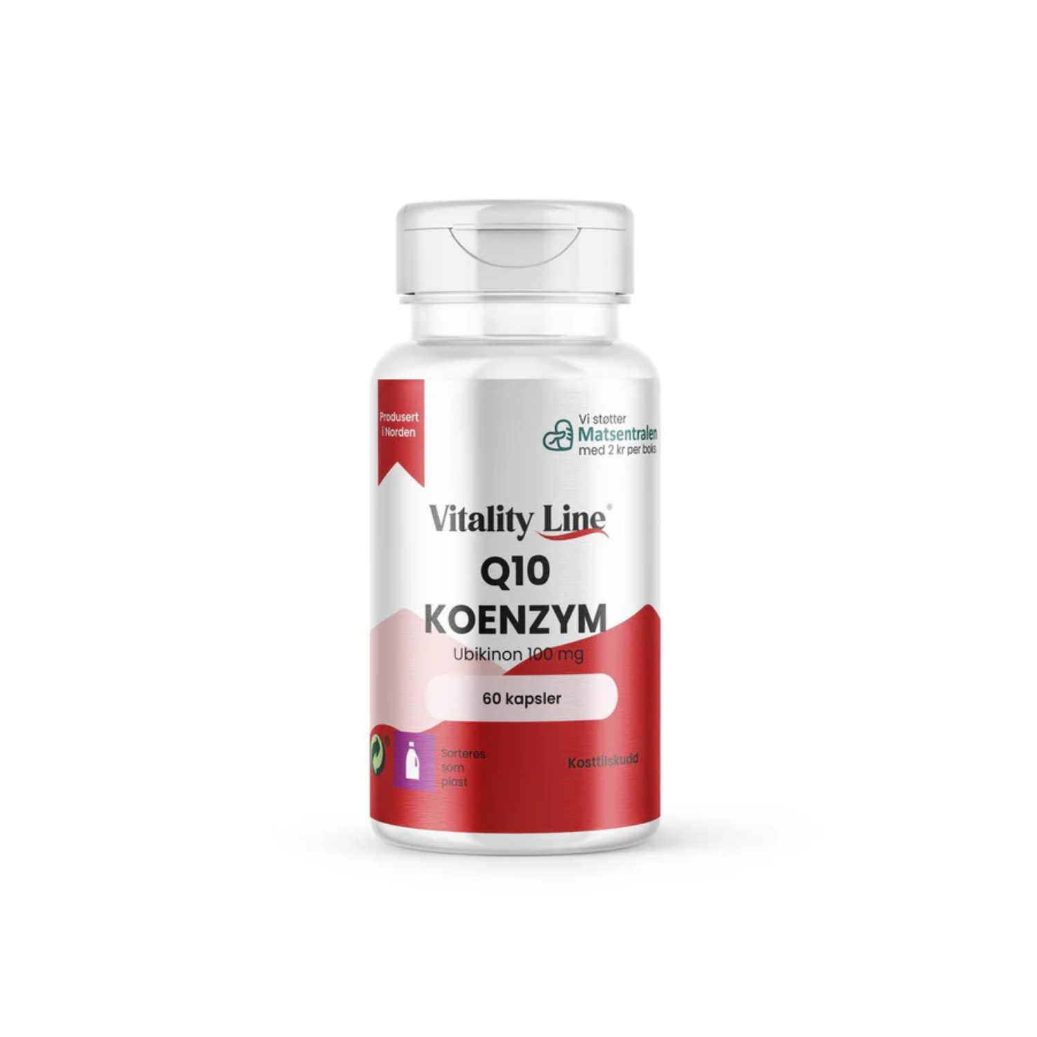 Vitality Line Q10 100 mg inneholder koenzym Q10 – et viktig stoff kroppen bruker i energiproduksjonen i cellenes mitokondrier. Q10 finnes naturlig i kroppen, men nivåene synker med alderen, ved sykdom og ved bruk av enkelte medisiner som statiner. Dette tilskuddet bidrar til økt energi, bedre utholdenhet og styrket hjertehelse.