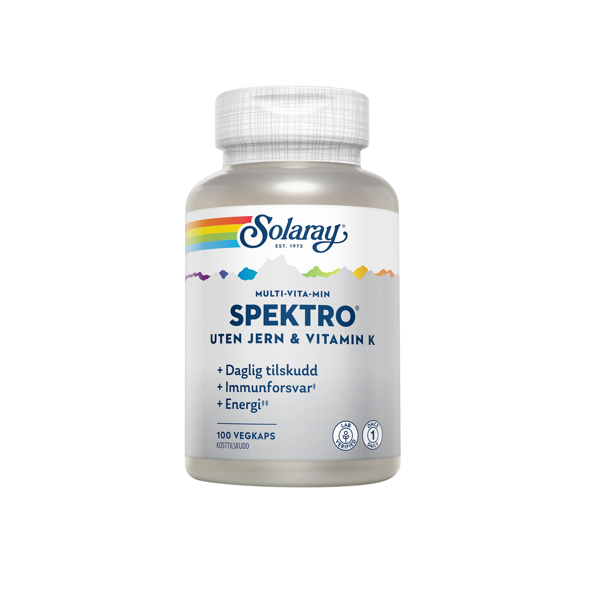 Solaray Spektro uten jern og vitamin K er et balansert kosttilskudd som inneholder et bredt spekter av essensielle vitaminer, mineraler, urter og sporstoffer. Denne varianten er spesielt utviklet for personer som ønsker å unngå tilskudd av jern og vitamin K, slik som ikke-menstruerende kvinner, menn over 40 år og de som bruker antikoagulerende medisiner.